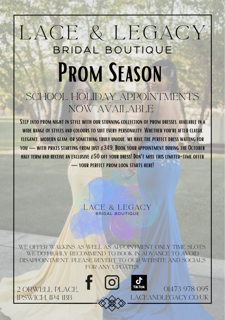 We have a wonderful range of gorgeous prom dresses available in store today. Book an appointment over the October half term and you will automatically get £50 off a dress of your choice.